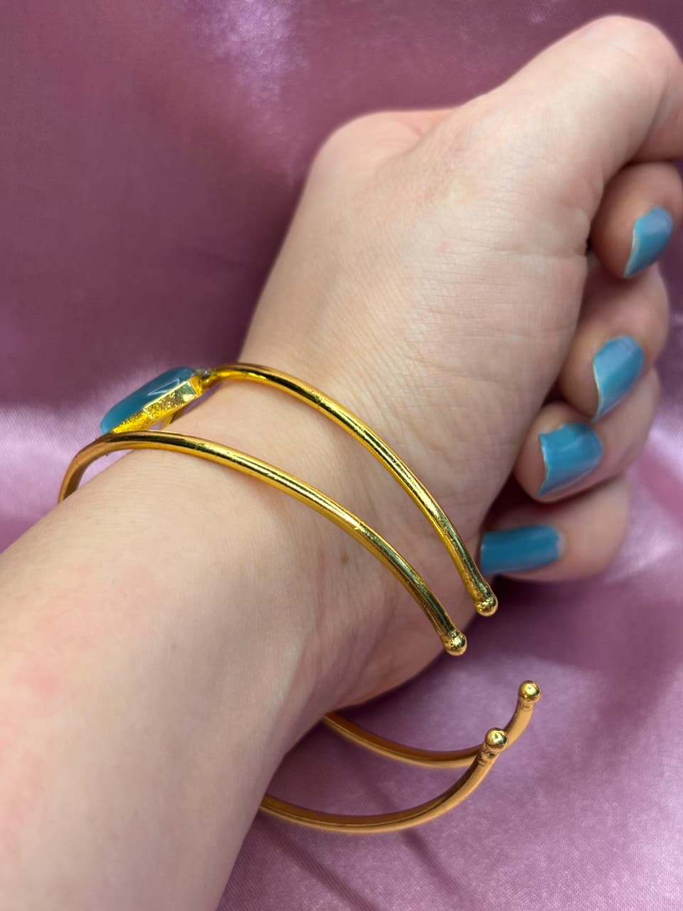 Add a touch of refined elegance to your jewelry collection with this beautifully crafted artificial gold bracelet. Designed with a sleek open-cuff structure, this piece features smooth, polished teardrop-shaped stones in sophisticated shades, perfectly set in a radiant gold-tone frame.