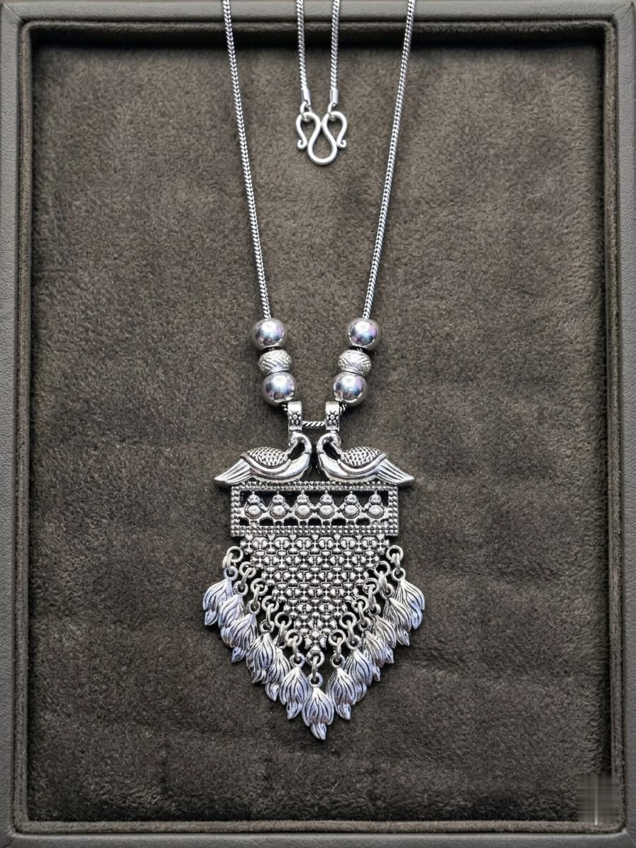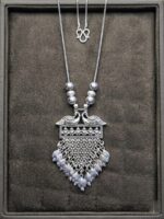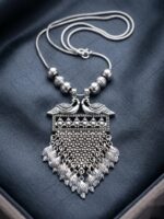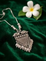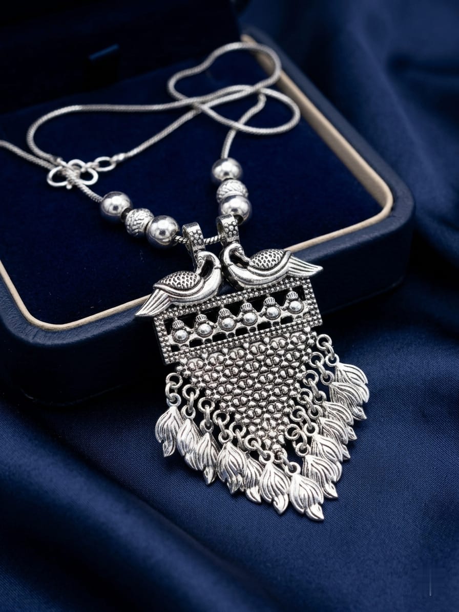 Elevate your jewellery collection with this stunning Artificial Oxidised Silver Peacock Pendant Necklace, designed to reflect traditional elegance and artistic craftsmanship. The pendant features a beautifully detailed twin peacock motif at the top, symbolizing grace, beauty, and prosperity.