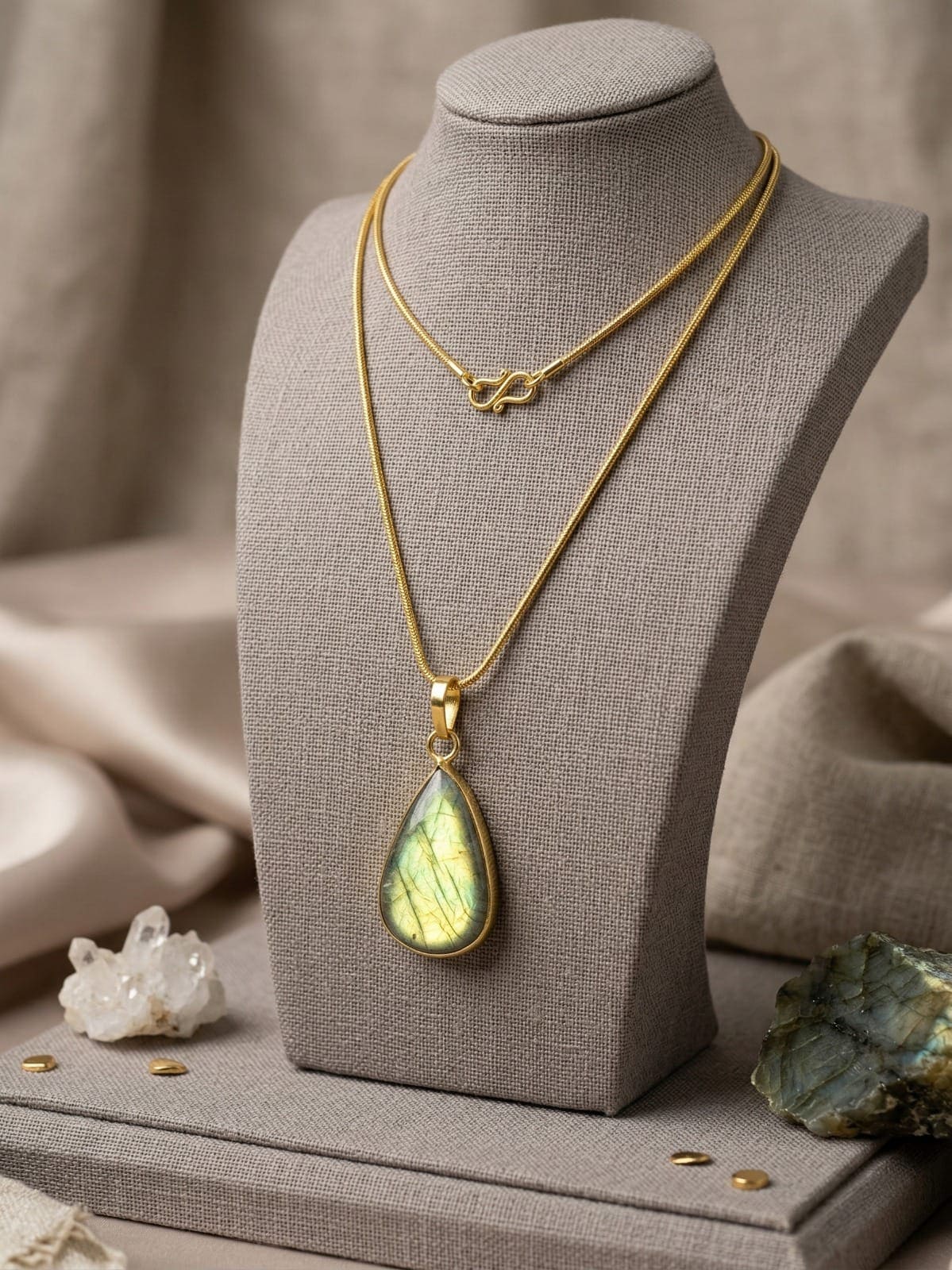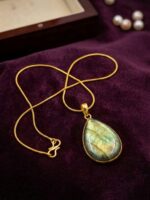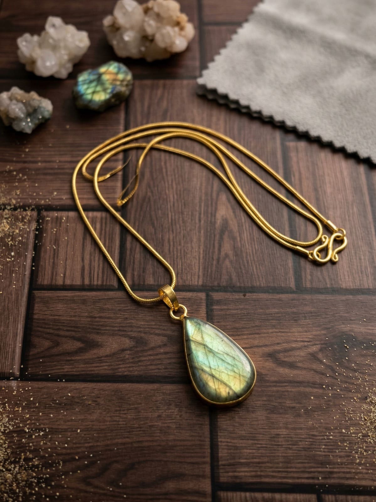 Apne style ko ek ethereal touch dein is stunning Aurora Labradorite Teardrop Necklace ke saath. Yeh pendant ek natural Labradorite stone se bana hai, jo apni mesmerizing “labradorescence” (shimmering colors) ke liye jaana jaata hai. Jab is par roshni padti hai, toh yeh peacock blue aur golden-green ke haseen shades reflect karta hai, jo har piece ko unique banata hai.