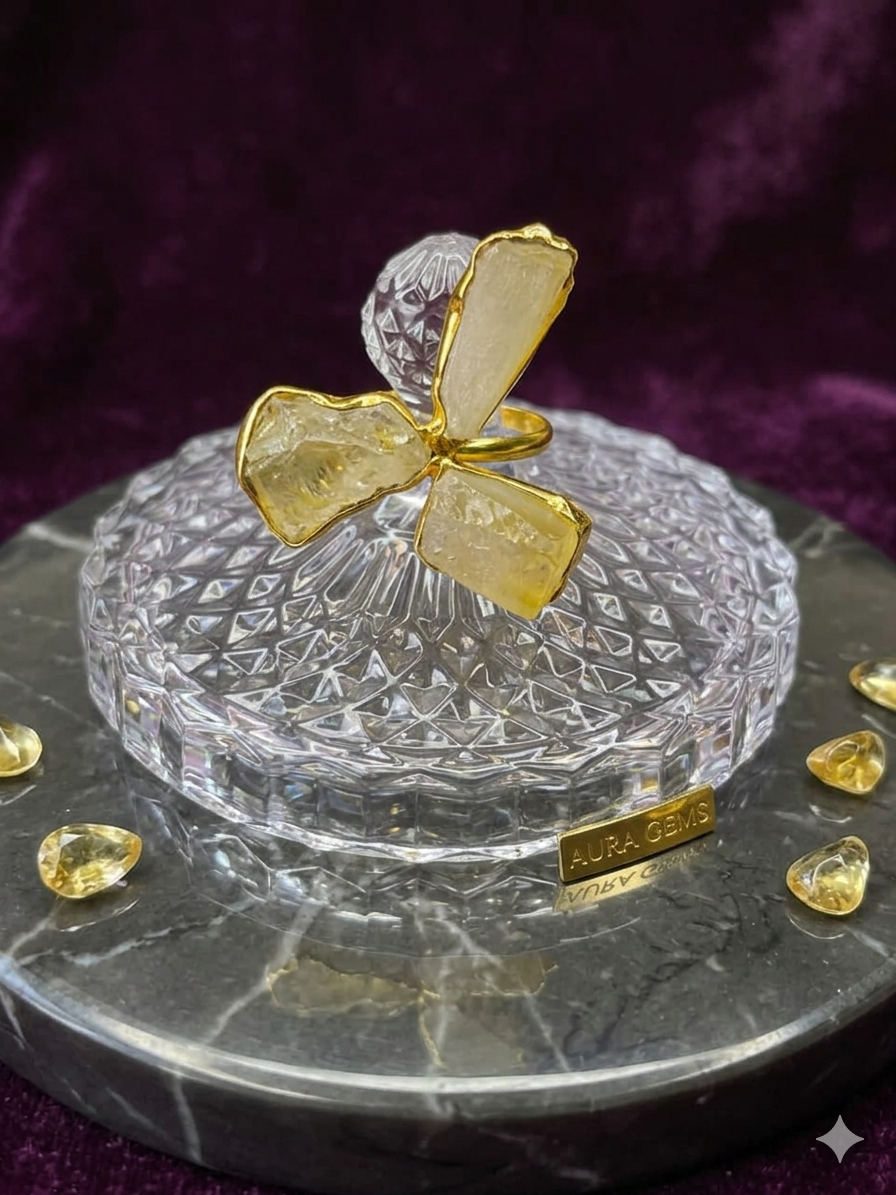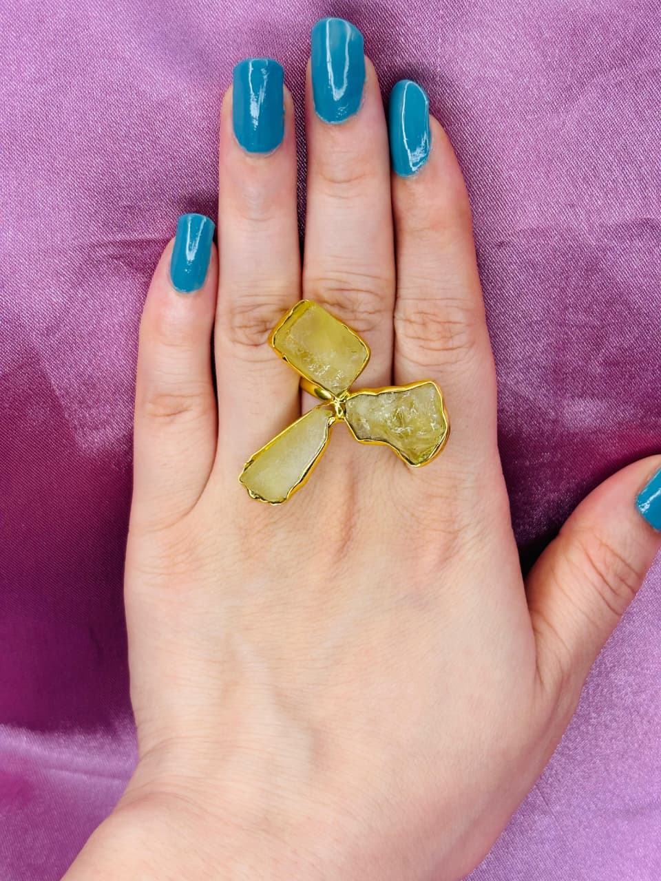 Add a radiant touch to your jewellery collection with this handcrafted statement ring, featuring three raw yellow stones arranged in a distinctive floral-inspired design. The warm, golden hues of the stones reflect natural light beautifully, creating a soft glow that enhances its elegant appeal. Each stone is uniquely shaped, highlighting the organic textures and making every piece truly one of a kind.
