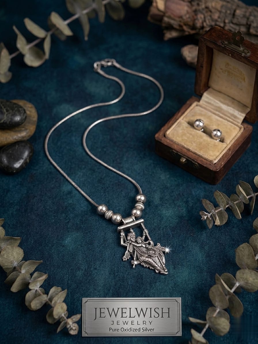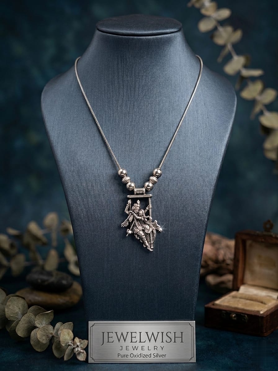 Elevate your collection with this intricately designed oxidised silver necklace, featuring a beautifully detailed Radha Krishna pendant that reflects timeless devotion and artistic craftsmanship. The pendant is elegantly suspended from a sleek black cord, accented with oxidised metallic beads that enhance its traditional yet contemporary appeal.