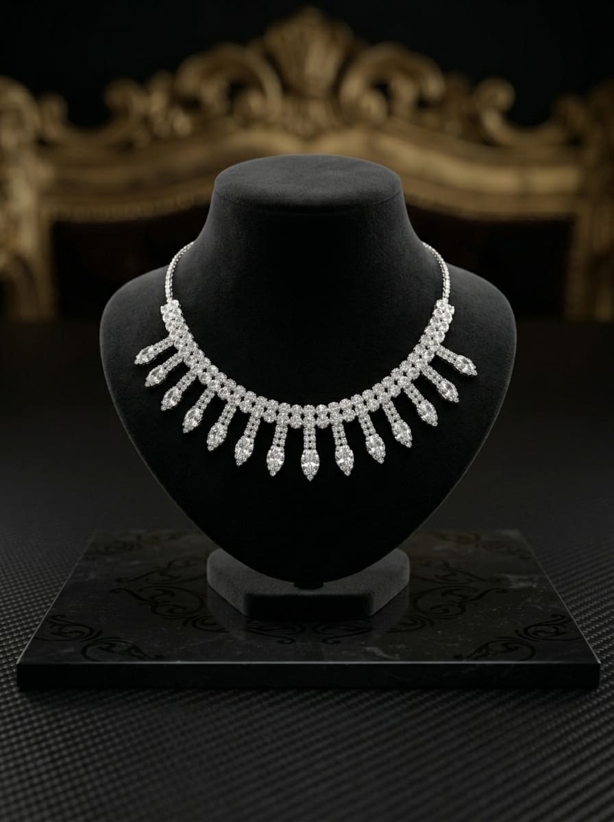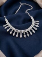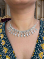 Make a bold and elegant statement with this beautifully designed artificial necklace, fully handcrafted with exceptional attention to detail. Featuring a graceful fringe design, this necklace is adorned with dazzling crystal stones that cascade delicately along the neckline, creating a radiant and eye-catching effect.