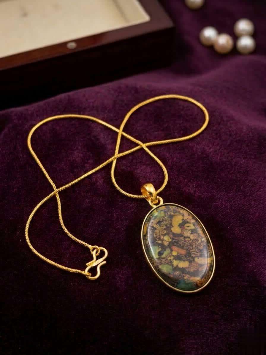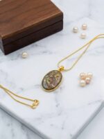 Nature’s own masterpiece. This stunning oval pendant features a one-of-a-kind stone with intricate patterns of green and gold. Whether you’re dressing up a simple turtleneck or adding flair to a cocktail dress, this piece brings a touch of organic luxury to any outfit.