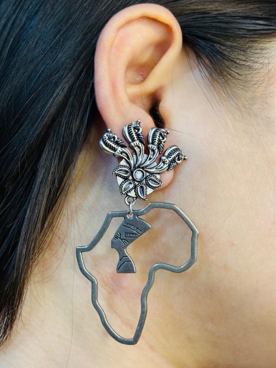 Make a bold and meaningful style statement with these uniquely designed oxidised silver Africa map earrings. Featuring an intricately crafted top with traditional motifs, the design flows into a striking outline of the African continent, accented with a detailed artistic face cutout.