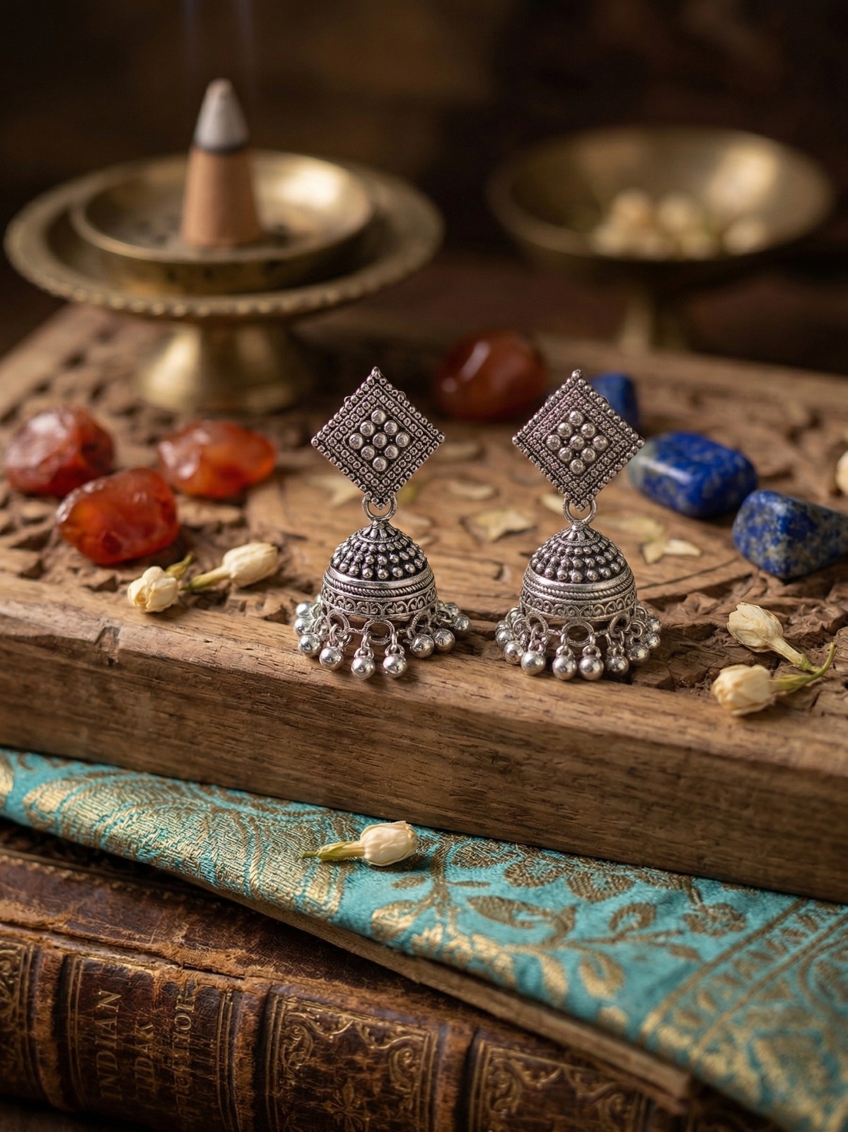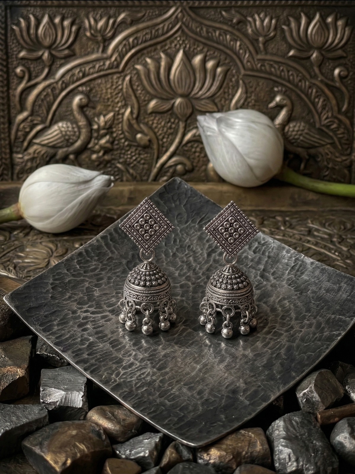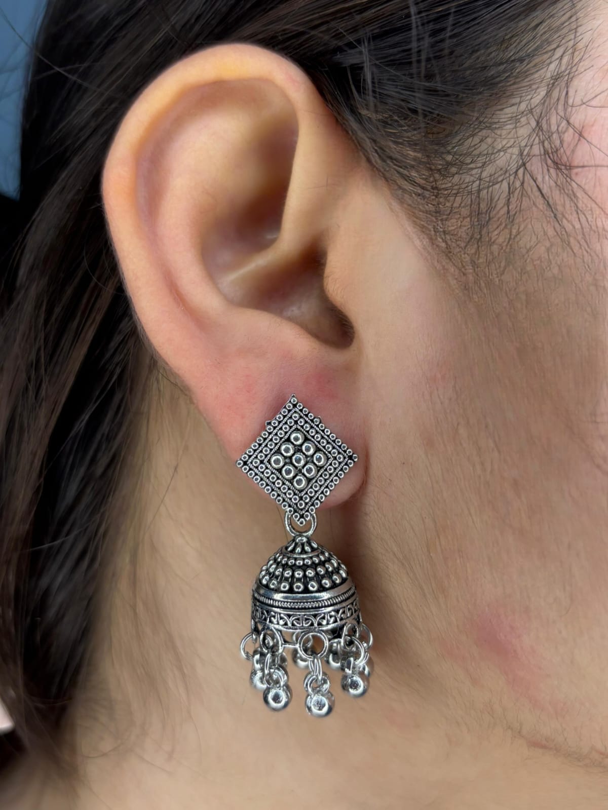 Elevate your ethnic style with these elegantly crafted oxidised silver geometric jhumka earrings. Featuring a beautifully detailed square-shaped stud with intricate beadwork, this design blends traditional charm with a modern geometric touch.