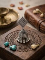 The finely carved dome-shaped jhumka is adorned with delicate patterns, complemented by tiny dangling beads that add graceful movement and a classic appeal. The antique oxidised finish enhances the detailing, giving these earrings a rich and timeless look.