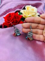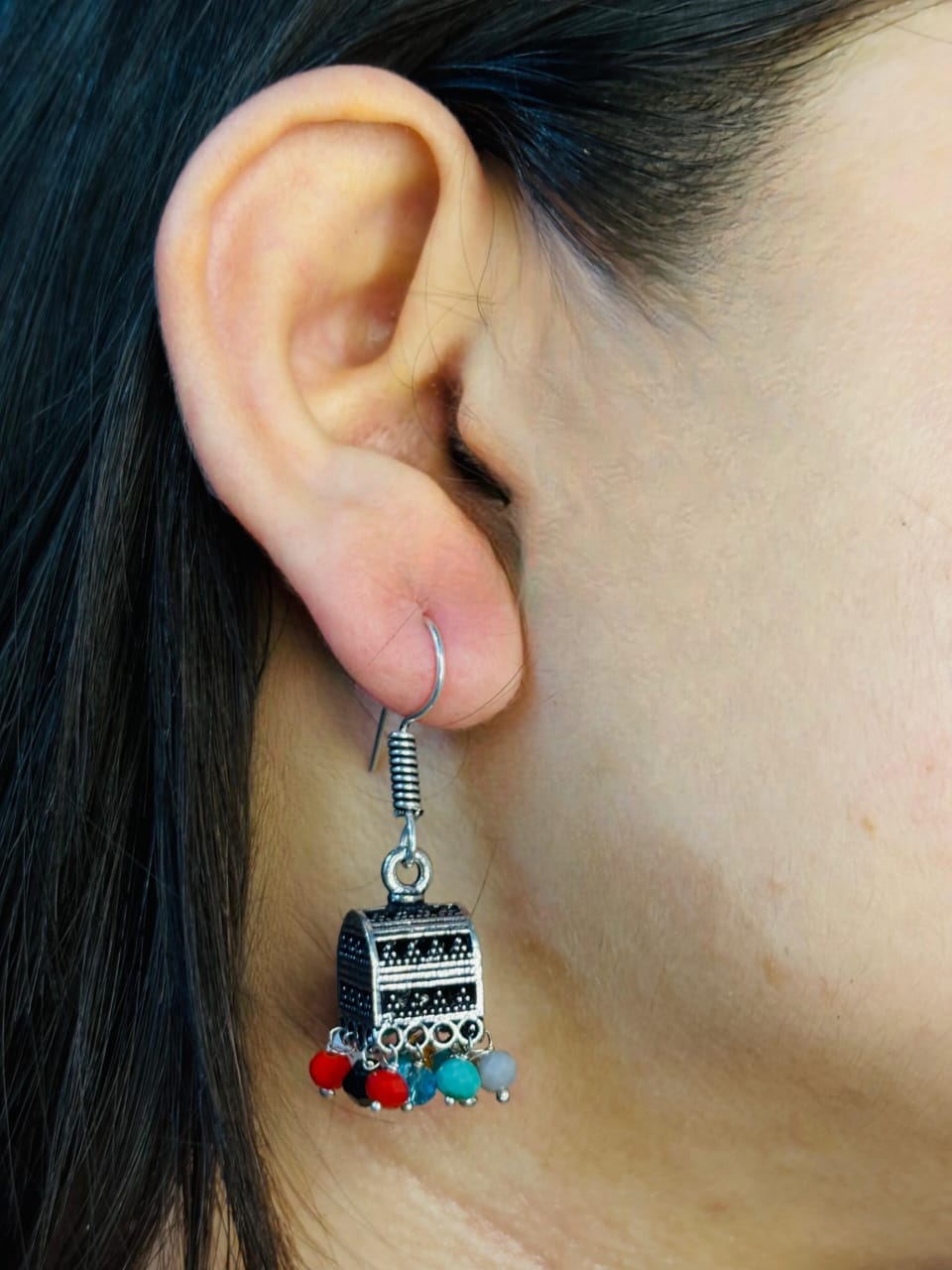 The base is adorned with colorful bead drops that bring a lively charm and subtle contrast to the antique silver finish. The combination of classic oxidised metal with playful hues makes these earrings perfect for festive occasions, casual outings, and fusion styling.