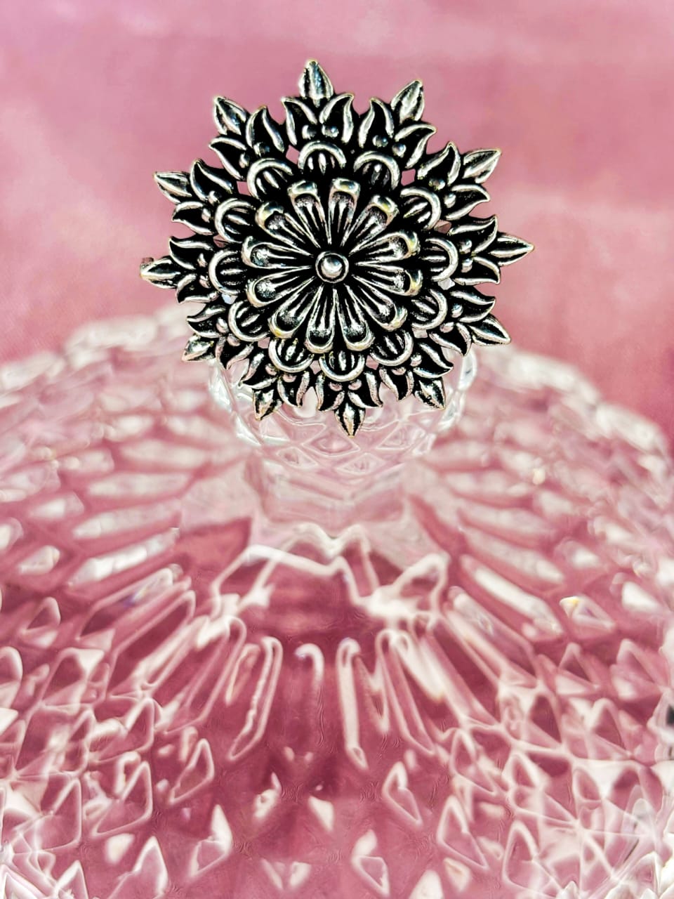 Make a bold style statement with this beautifully crafted oxidised silver floral ring. Designed with intricate detailing, this eye-catching piece features a stunning blooming flower pattern that reflects traditional artistry with a modern touch.